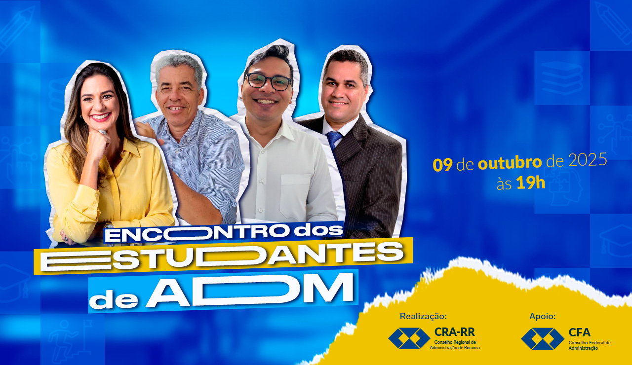 Últimas Notícias Boa Vista–RR sedia Workshop de Gestão Pública e entrega do Prêmio IGM/CFA de Governança Municipal“Administração nas Telas”: CRA-RR encerra mês de celebrações com sessões de cinema em Boa VistaA Administração nas telas: Documentário celebra 60 anos da profissão no BrasilBoa Vista sedia Workshop de Gestão Pública nos dias 18 e 19 de setembroCâmara Municipal de Boa Vista homenageia administradores nos 60 anos da profissãoHomenagem reúne profissionais no Jubileu de Diamante da Administração123…11›Palavra do Presidente Calendário de Eventos There are no upcoming events at this time. Últimas Publicações Confira outras publicações