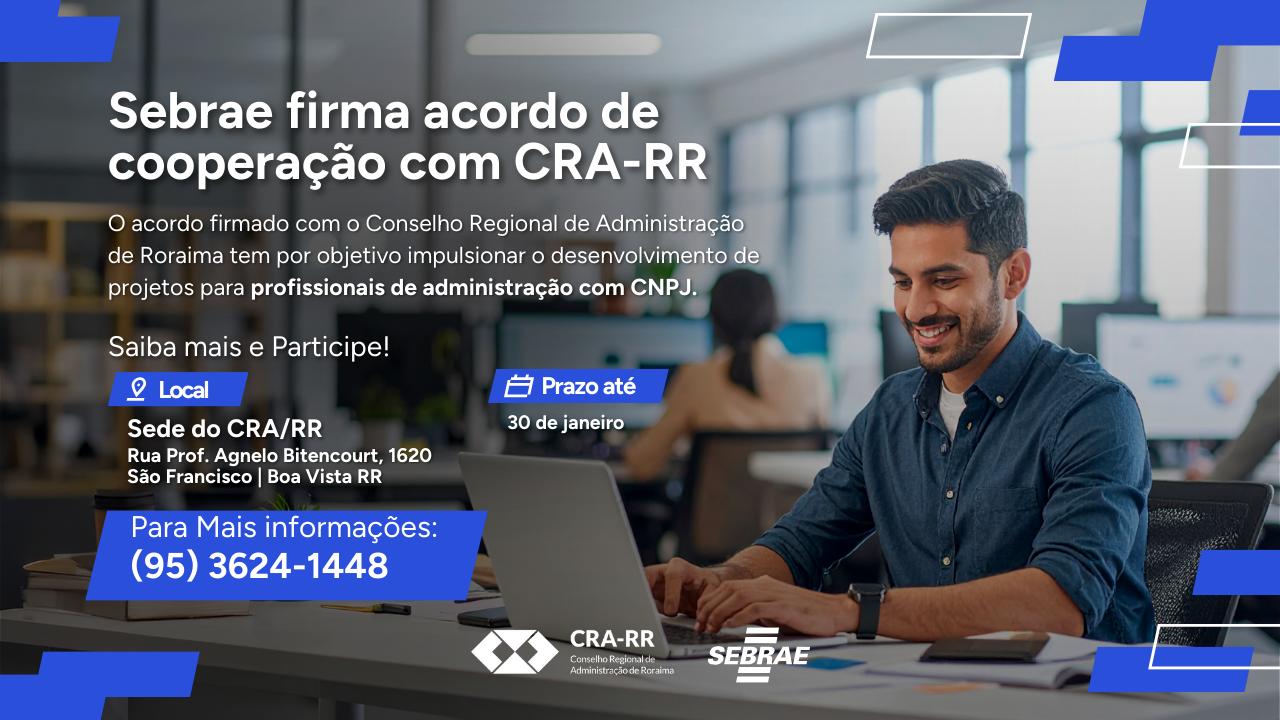 Últimas Notícias CRA-RR e Sebrae avançam em plano de trabalho para capacitação de administradores empreendedores em Roraima Roraima conquista 3º lugar nacional no Prêmio CFA de Jornalismo 2025 Comissão ADM Empreendedor define diretrizes do Plano de Trabalho para 2026 ADM Jovem projeta agenda inovadora para 2026 CRA-RR e Sebrae Roraima firmam parceria para impulsionar profissionais de Administração CRA-RR encerra comemorações do Jubileu de Diamante da Administração com debate sobre viver com propósito 1 2 3 … 13 › Palavra do Presidente Calendário de Eventos There are no upcoming events at this time. Últimas Publicações Confira outras publicações